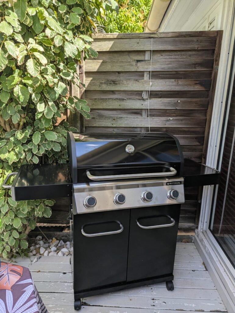 Jardin aménagé avec pergola couverte et jacuzzi 4 places pour une détente garantie.