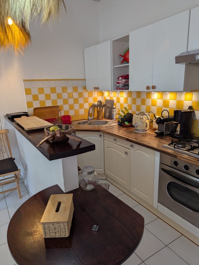Préparez vos saveurs locales dans une cuisine lumineuse et parfaitement équipée, alliant charme rustique et équipements modernes.